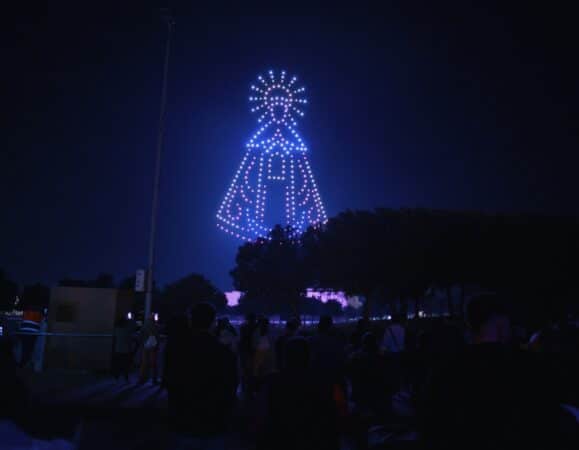 Cada figura se movió con precisión milimétrica, creando transiciones fluidas y escenas luminosas que combinaron tradición, identidad y tecnología drone en una experiencia apta para personas sensibles al ruido y mascotas al no generar sonidos fuertes ni residuos.